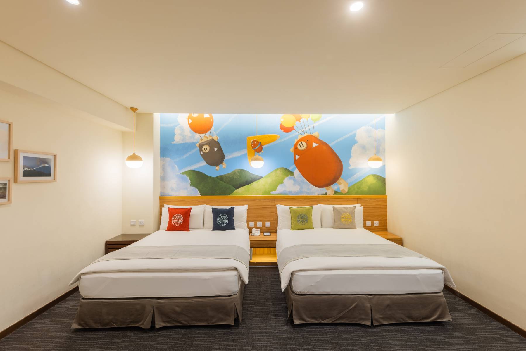 和煦的暖陽透過整面落地窗輕柔的躍入在客房內每個角落,就似大夥共享出遊喜悅幸福的笑容。柔和的燈光、舒適的大床、質樸的書桌,配置上溫潤木質傢俱,舒心潔白的壁面妝點上溫馨掛畫,房內一角以簡單線條勾勒出特製行星掛衣架,霎時充滿光的正面能量,戶外露台小沙發區則是享受著自然環繞悠閒時光,讓旅途中擁有著家的溫度。